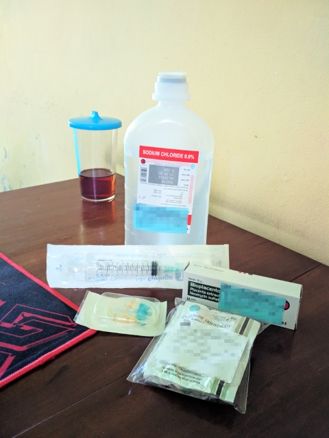 Sebelum pulang, saya diberi oleh-oleh dari apotek rumah sakit berupa sebotol NaCl, suntikan, obat, dan sebuah salep, yang kemudian saya gunakan untuk treatment di rumah hingga beberapa hari ke depan.