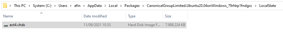 Sebelum memulai, silakan cek lokasi dan ukuran virtual disk kita. Lokasi virtual disk WSL2 berbeda-beda, tergantung distro yang kita install. Untuk distro yang saya pakai, Ubuntu-20.04, lokasi virtual disknya ada di C:\Users\afin\AppData\Local\Packages\CanonicalGroupLimited.Ubuntu20.04onWindows_79rhkp1fndgsc\LocalState\ext4.vhdx dengan ukuran 7,9 GB
